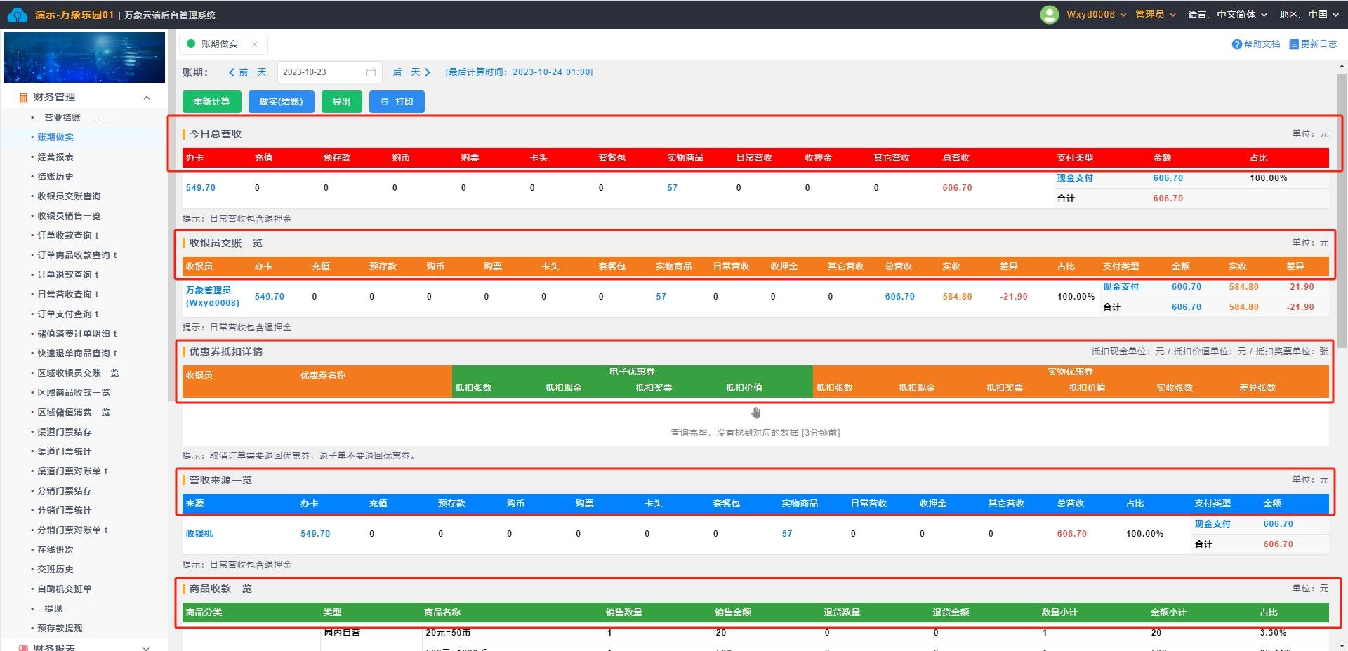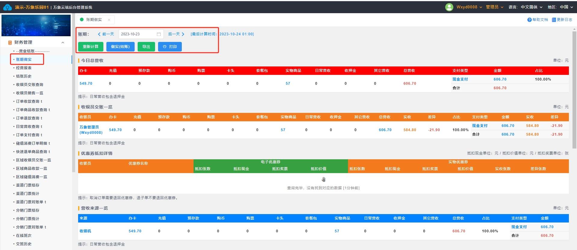 2. 选择查询条件账期当天日期,重新算计(报表更新时间为一个小时一次,重新算计可以实时更新当日营收报表),做实账期(确认账期数据后做实账期,由出纳做实账期后内容不可以更改)