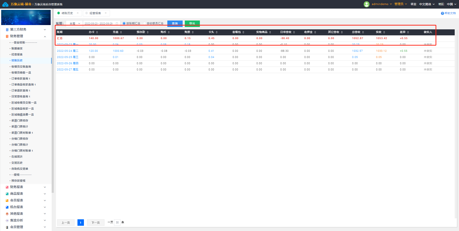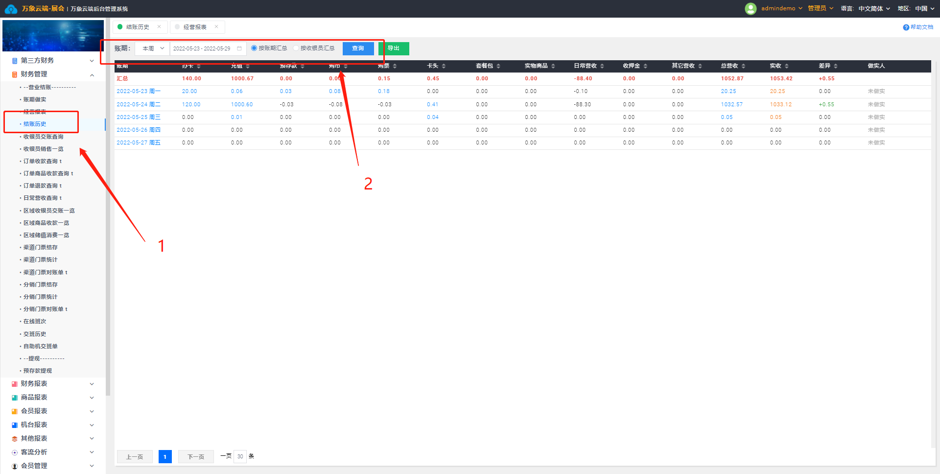 2. 选择查询条件账目日期、汇总方式按账期汇总或者按收银员汇总