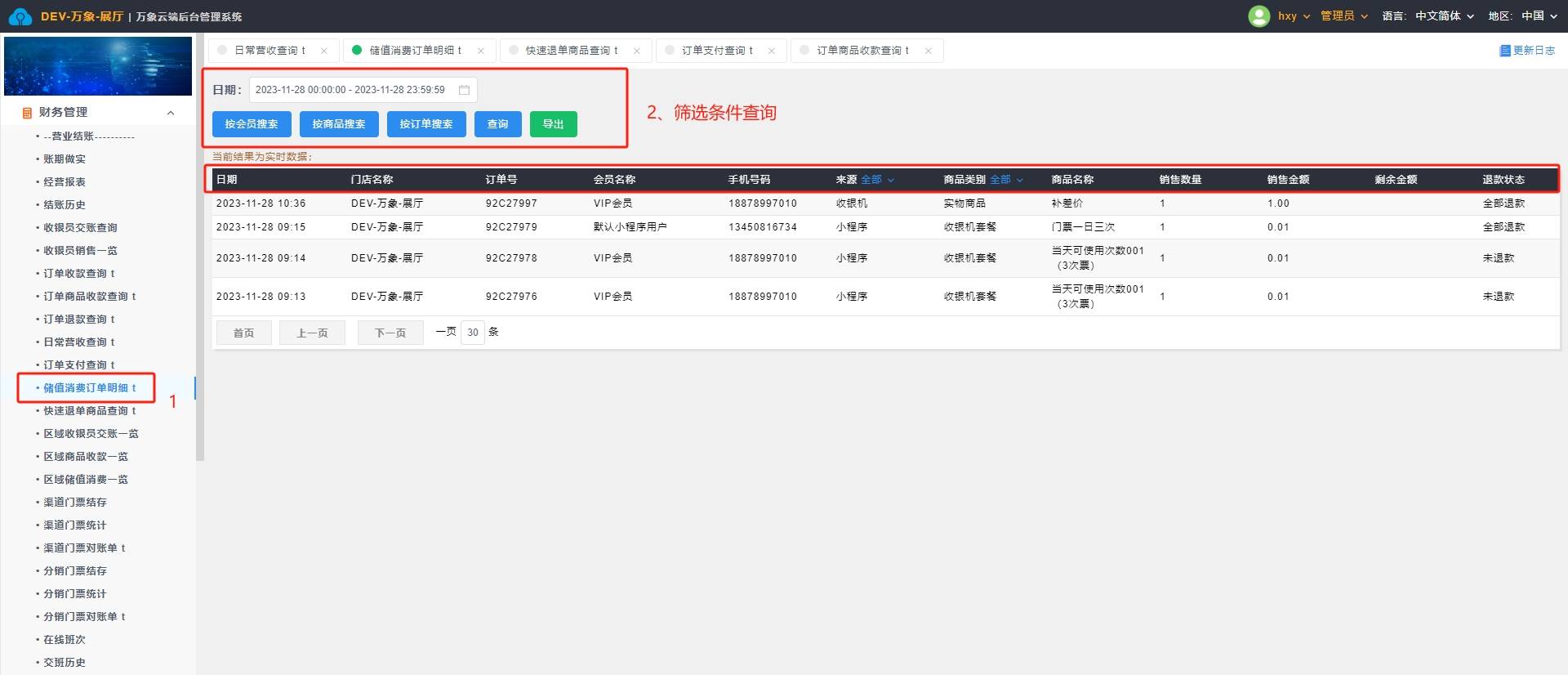 2. 选择查询条件日期、会员卡号编码姓名手机、商品名称编号/货号、订单号等条件筛选查询