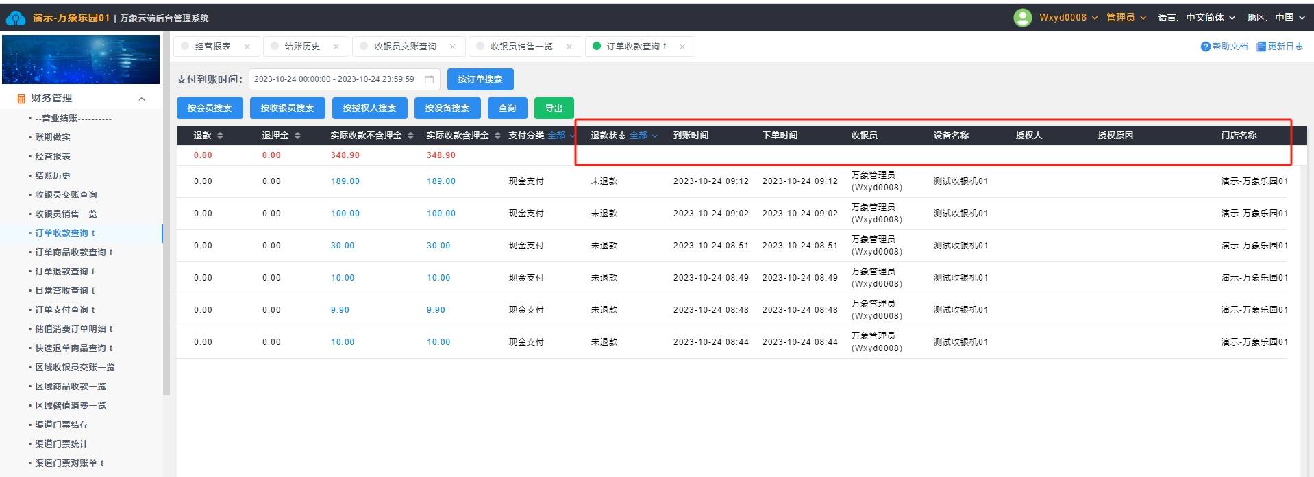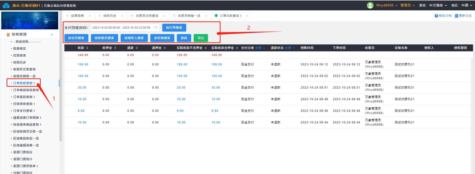 2. 选择查询条件支付到账时间段、订单号、会员的卡号编码姓名手机号码、收银员姓名、授权人姓名、设备名称