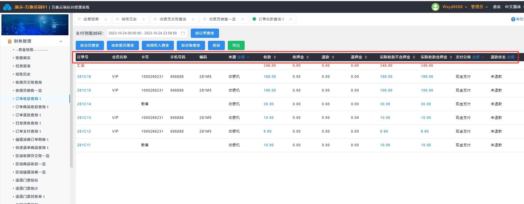 - 实际收款不含押金:实际收的订单收款,不包含押金