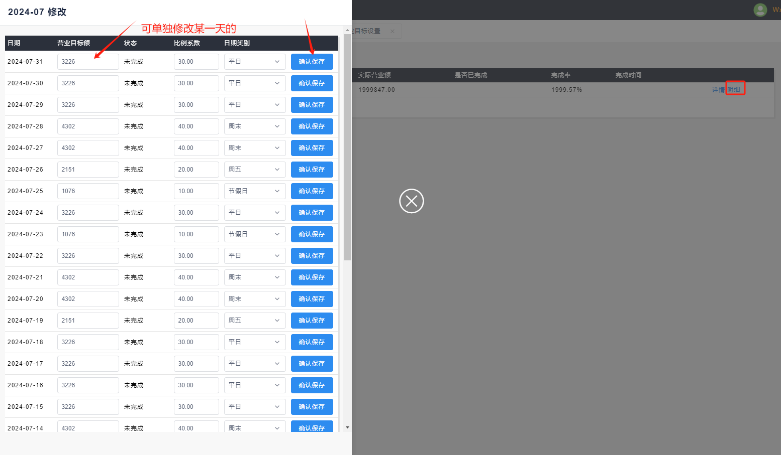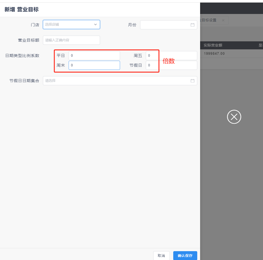 2、填写门店,设置目标的月份,目标总额,日期类型营业目标倍数,节假日的时间
