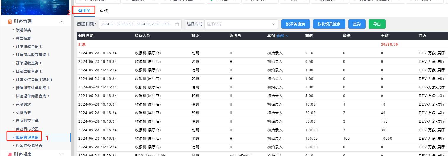 现金管理查询:用于查询前台收银,交班处录入的备用金明细跟取款的明细。
