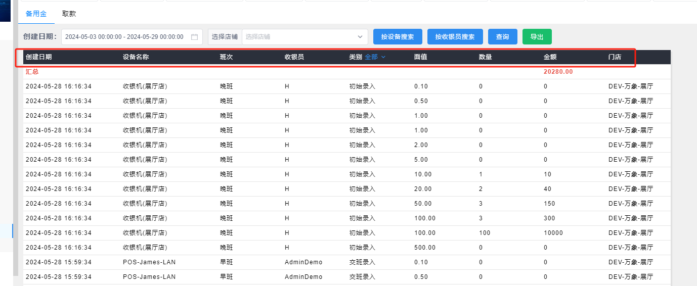 - 创建时间:前台收银备用金录入的时间