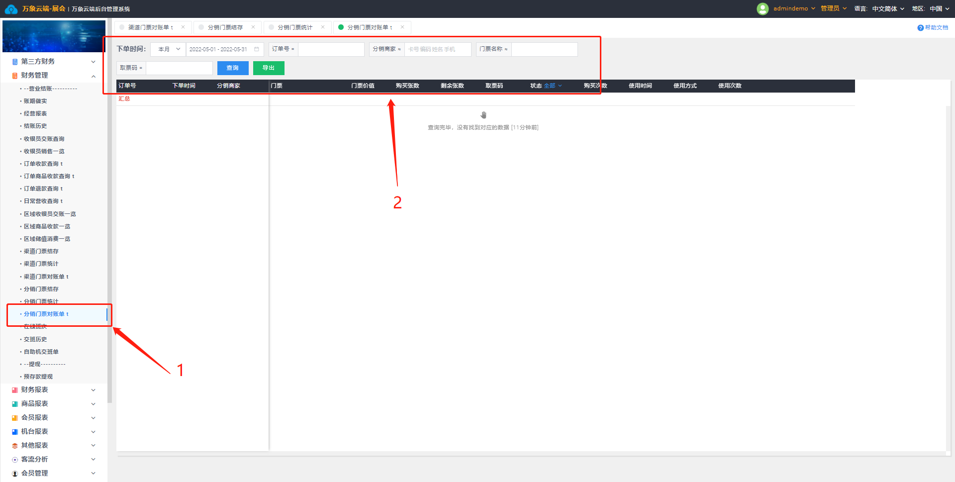 1. 点击财务管理-分销门票对账t