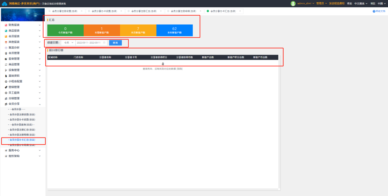 汇总:显示今天客户数量、本周新客户数量、本月新客户数量、本年新客户数量的会员分享办卡汇总