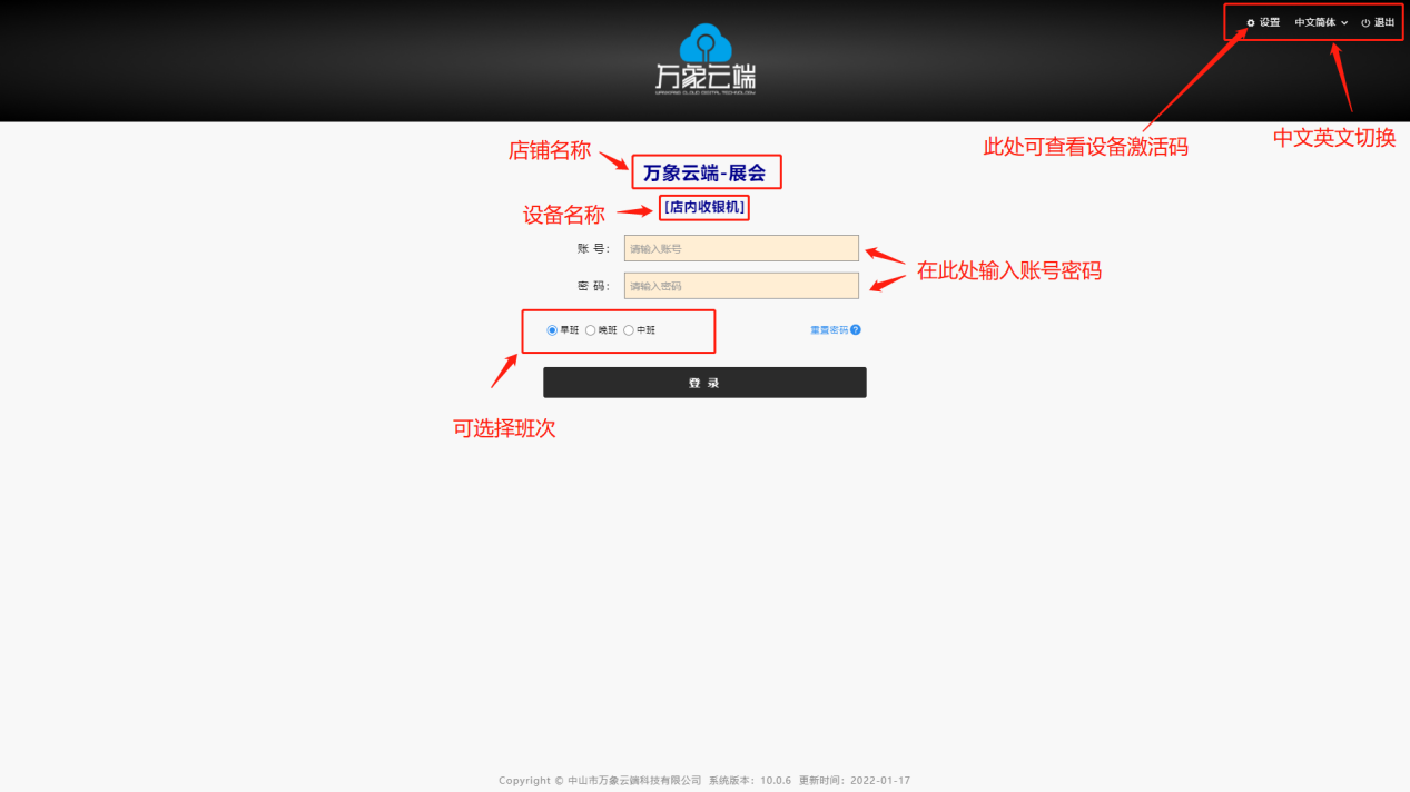 在软件登录页面输入已授权的收银员账号密码并登录。注:若店内有分多种班次,应选择对应班次登录。