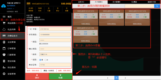 【办理会员卡】→【选择套餐】→【填写资料】→【结算】