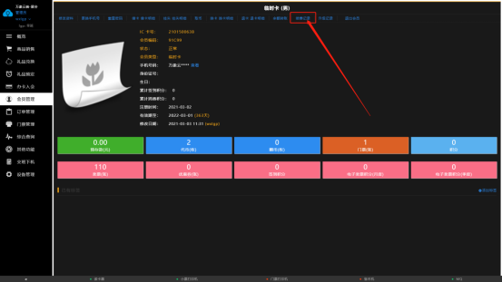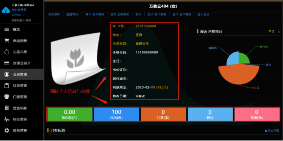 办卡后,推荐到“会员管理”页面查看会员信息与金额是否准确无误与卡内余额流水明细