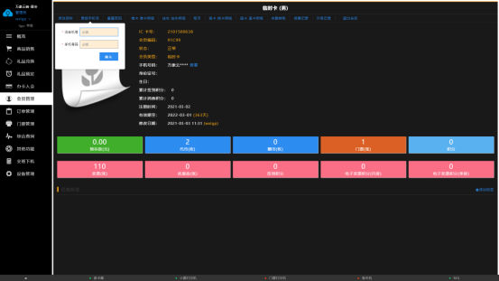 当客户忘记或没有带会员卡时,可以通过预留的手机号码查询该会员卡的信息,然后通过借卡,把他没带的会员卡里的余额转到新卡上,等他用完点击还卡,新会员卡使用后的余额会还给旧卡,当然要借卡是可以设置借卡的押金的,押金需要在后台设置