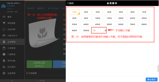 进入会员管理页面,点击取币在弹出的框内选择要取的币数点击确认取币