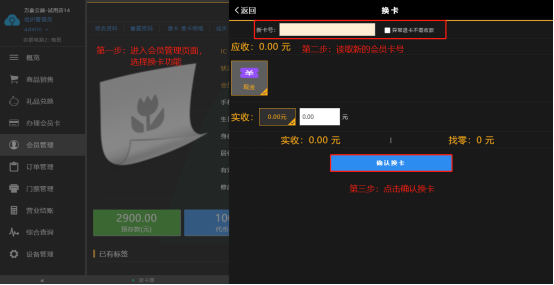 进入会员管理页面,点击换卡,在弹出换卡框后读取新卡号,最后点击确认换卡
