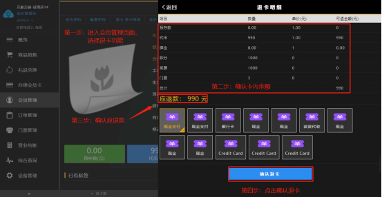 进入会员管理页面,点击退卡,进入退卡页面,在确认会员余额和应退款无误后点击确认即可 注:退卡所需授权码可在后台设置