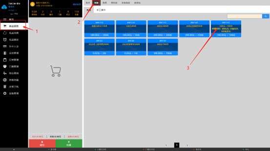续费会员有效期时间,首先得点击1处商品销售—》2处充值目录里选择续费的充值套餐即可(注意:当会员有效期的时间大于充值给予的时间是,系统会按最大的时间来定,不会累计加)