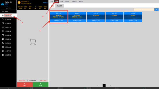 升级会员级别,首先得点击A处商品销售—》B处充值目录—》C处选择会员升级套餐,点击充值即可