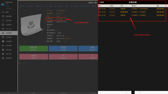 升级完成后会员卡的会员级别会显示成你升级后的级 别,和升级记录 (注意:会员卡升级,前提必须要顾客的会员卡是会员级别,临时卡是不能升级的,只有是会员级别的会员才能升级更高的级别,升级的级别与本身级别相同下,会员级别不变)