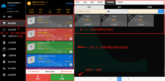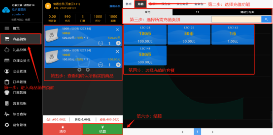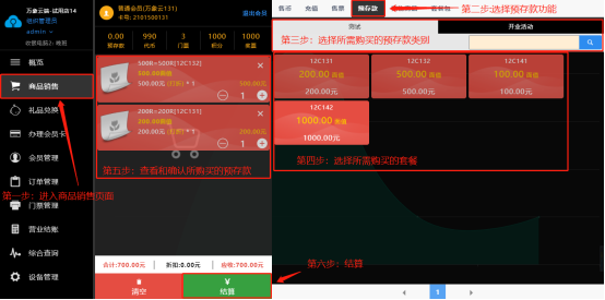 进入商品销售页面,选择预存款功能;选择所需套餐之后,点击结算即可购买,可以在会员管理页面查询