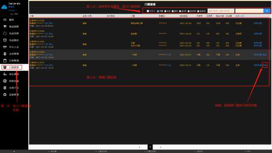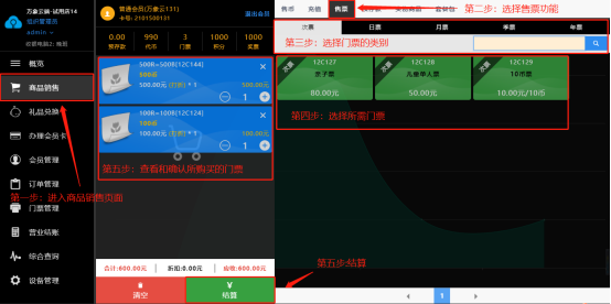 进入商品销售页面,选择售票功能;有次票,日票,月票,季票,年票等,在选择好门票分类之后选择所需套餐点击结算,结算后购买完成,可以在会员管理页面查询所拥有的的门票