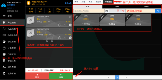 进入商品销售页面,选择实物商品功能;选择所需商品后点击结算,结算后购买完成