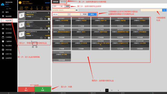 进入礼品兑换页面,选择奖票兑换功能;充值和使用会员卡会产生相应的奖票,可以用奖票来进行兑换相应的商品,根据需要选择不同类别的商品后点击结算即可,也可用购物车进行大量兑换,兑换只消耗相应的奖票,可以在会员管理页面查询