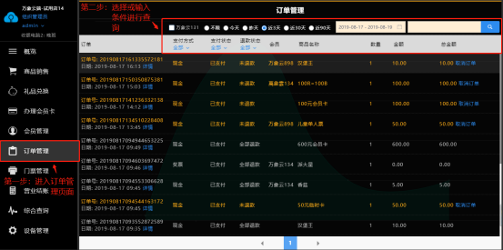订单查询:读卡状态下默认查询当前会员卡的订单;可以按时间段查询订单,也可以输入姓名精确查询,实时显示所有订单的最新状态,