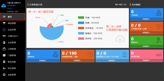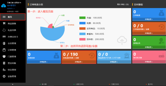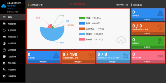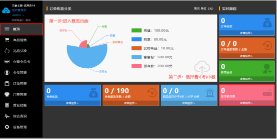 显示今天所有的收支与收支百分比,并自动生成扇形图表,还有订单退款金额和笔数、新增会员、售币机币数、库存提示、其他退款金额及币数、以及其他收入等,