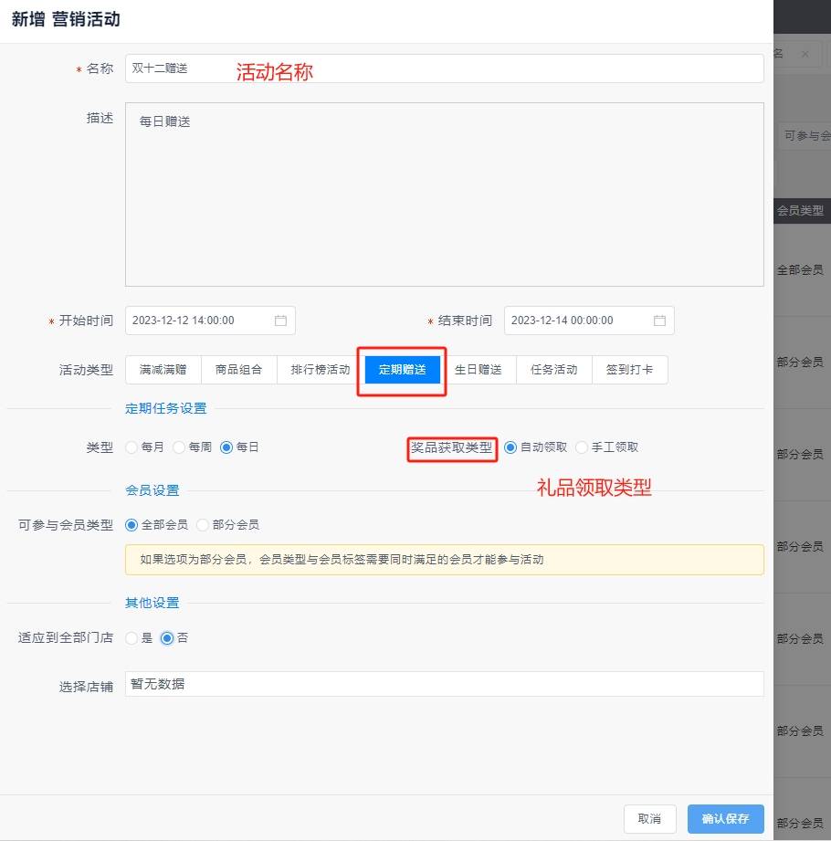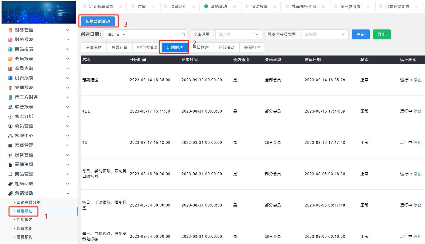 后台-->营销活动-->营销活动-->定期赠送-->新增营销活动-->填写详细单据信息(活动类型为定期赠送)-->确认保存