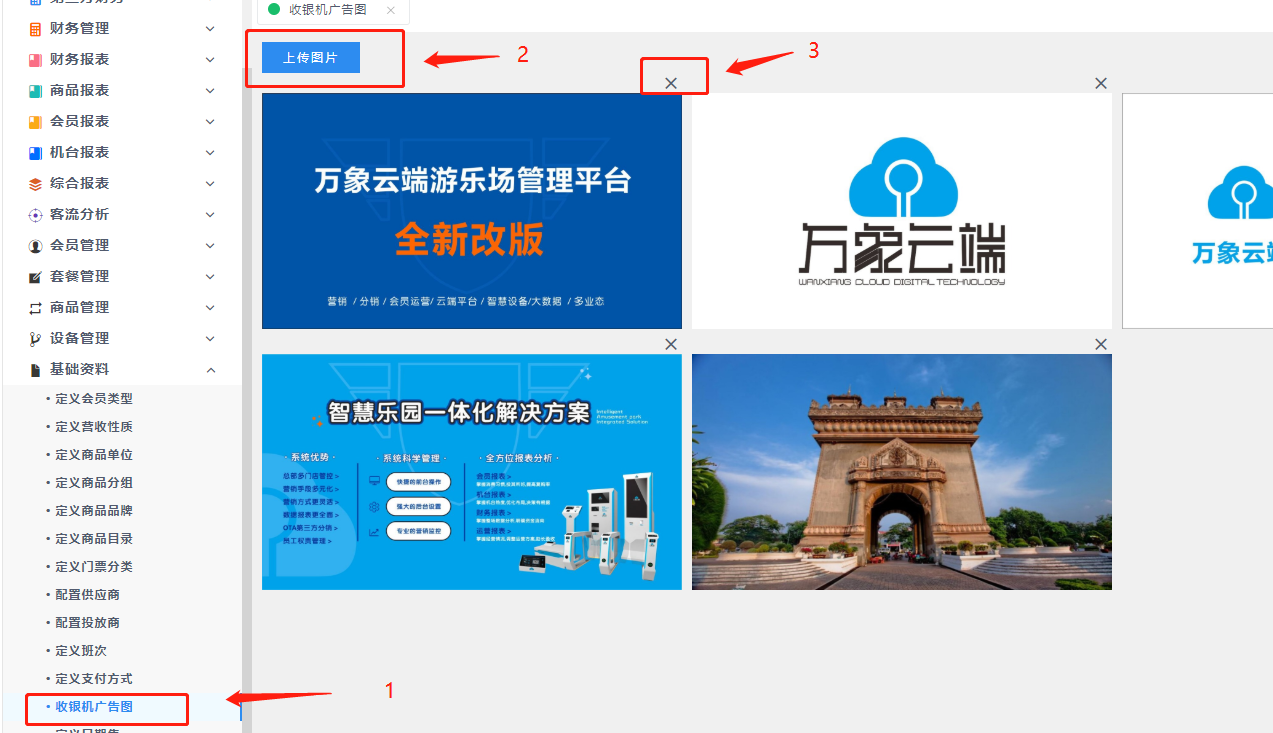 1、点击基础资料-收银机广告图 2、点击上传图片 3、点击×删除图片