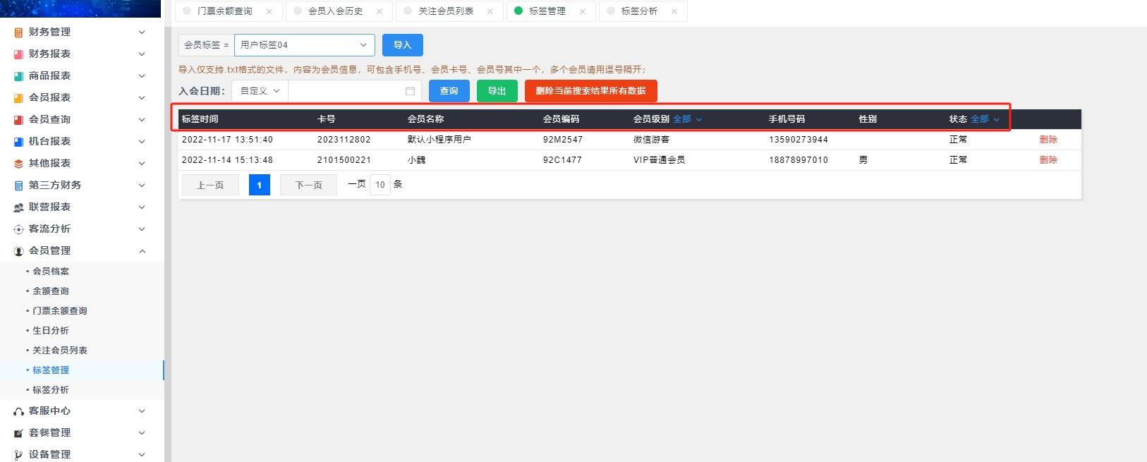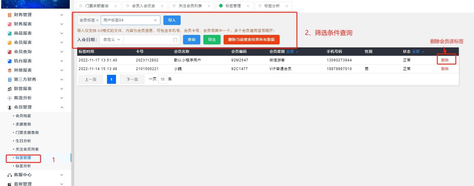 进入【会员管理】→【标签管理】→筛选会员标签、会员入会日期等条件查询