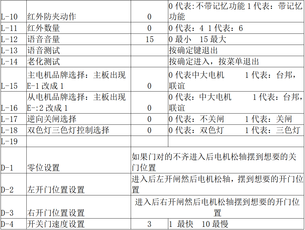 常见问题解析: 1:如果数码管出现E-1或者E-2,表示电机种类不对,L15,L16调成12.如果出现门不断开关,请把D-23调到03.如果两个门开关不同步,通过调节D-11主机电机转速和从主机电机转速D-13,那个速度快就把那个调节小。