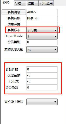 此步骤必须注意:必须先设置一个套餐,在套餐属性设置页面---点击【+】弹出套餐设置页面---套餐标志:售币---套餐页面---套餐名称---币数 5---价钱 0---【保存】后退出新增套餐页面---必须在右边把套餐标志修改为门票---可以填会员币数:3 币;点击提交改变按钮,设置完成;