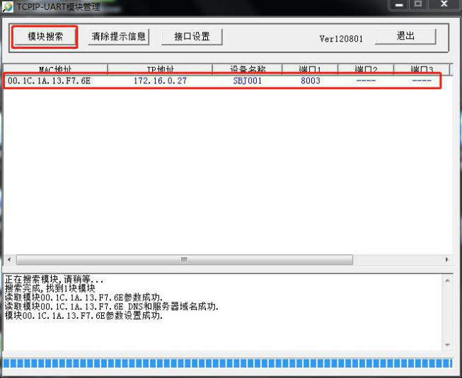 1)接收费终端机电源及网线后,打开 TCPManager.exe,单击模块搜索,双击,搜索到的 zd01; 如下图: