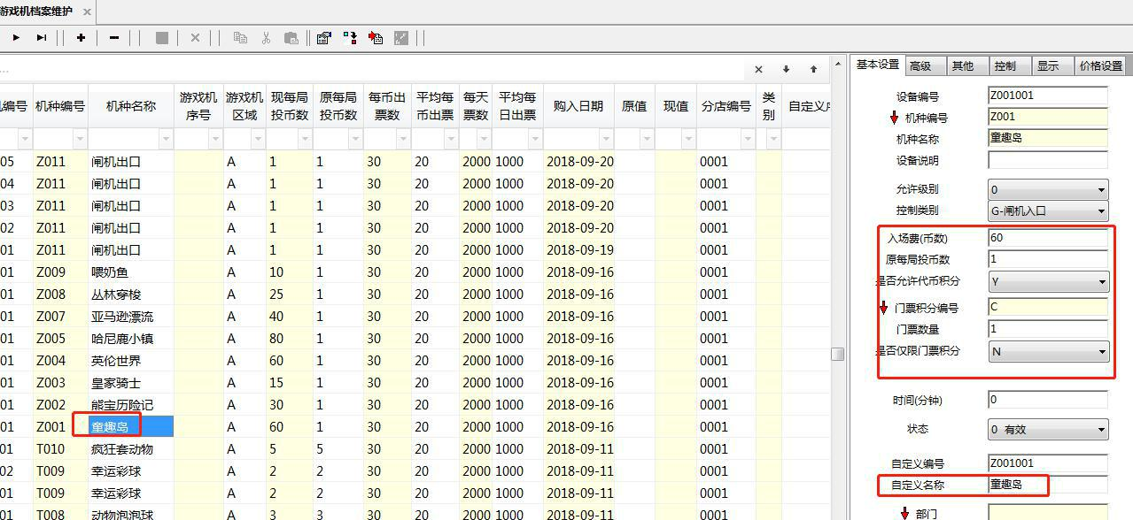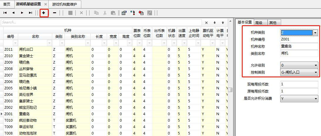 点击【设备管理】--【游戏机基础设置】,如下图,进入游戏机基础设置页面:点击【+】---按右边红框进行设置:机种编号不能重复,机种类别为 z,控制类别为闸机入口,设置完成并保存;