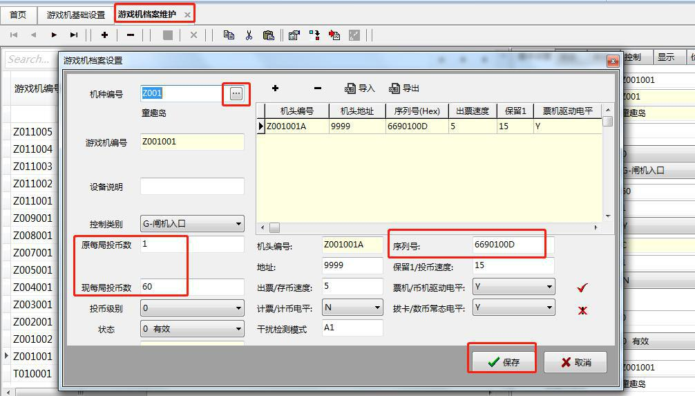 3)进击【设备管理】--【游戏机档案维护】,如下图,进入游戏机档案维护页面:点击【+】---在弹出的方框中选着步骤 2 中建立的 z001,设置现每局为 1,用每局投币数为 60(既是入场费),输入此收费终端的序列号,设置完成并保存;