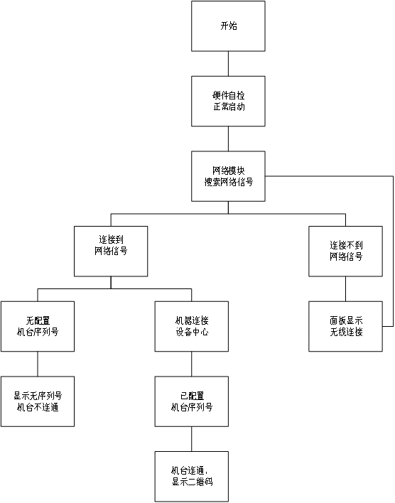 2、自助售币机启动流程:机台正常启动后,网络模块会自动搜索配置好的网络设置,当机台连接不到网络,主界面会显示“网络连接中”,直到连接到网络。连接网络后,机台连通设备中心,检查自身序列号是否配置到软件控制程序。如已配置,则显示二维码界面;没有配置,则显示无序列号。