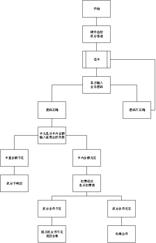 3、会员卡刷卡提币流程:机台连通,客户把卡插到机台上,机台的读卡模块感应卡片内的芯片,在显示屏上显示卡内的余额。显示的信息由设备中心控制,一般在30-60秒,客户在此时间内进行投币操作,超时后客户需要重新插卡。客户输入提币数,客户卡内余额充足,机台正常出币(机台币数不足,会把余款退回,提示售币机余币不足);卡内余额不足,界面不响应。