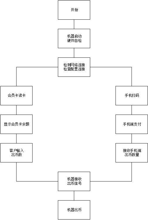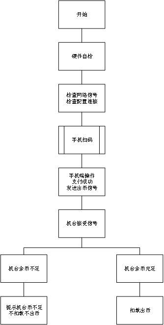 1、总流程图:连接机器,自助售币机启动后,网络模块会搜索配置好的网络配置自行配对。网络连接成功,自助售币机与设备中心控制程序进行连接,检查是否有配置,配置连接成功才能使用机台的会员卡提笔,手机扫码买币功能。