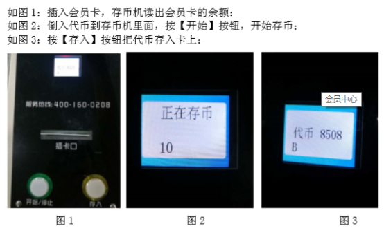 →硬币倒入币斗→插入会员卡→按开始按钮→确认存入币数→拔出会员卡